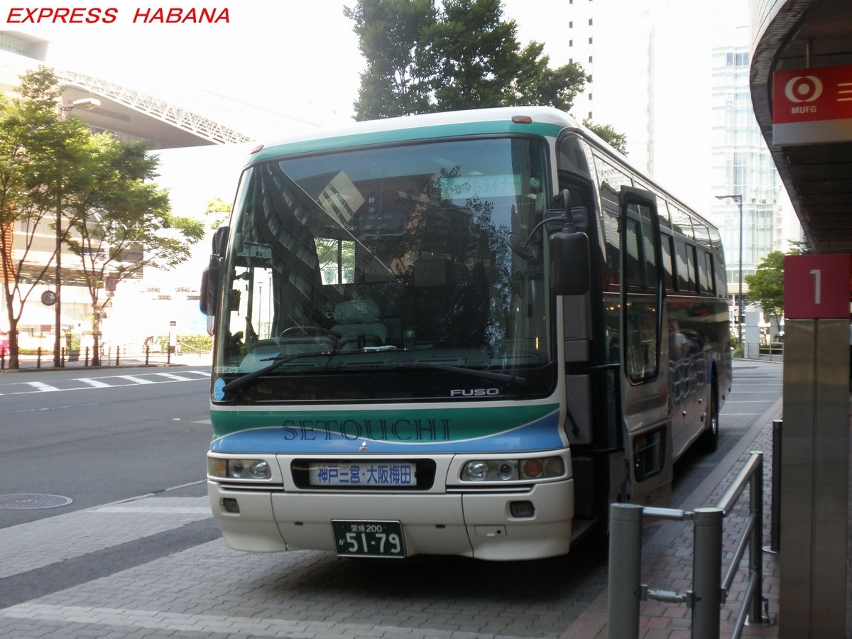 2013-08-22 瀬戸内運輸(せとうちバス) 高速バス 四国地方 運行事業者:瀬戸内運輸(せとうちバス)所属営業所:今治営業所 登録番号:愛媛200か51-79社内番号:不明 形式:PJ-MS86JP/エアロバス 製造(登録)年月:2006年 シート配列:2-2シート 座席定員:40人 設備:後部トイレ用途:「いしづちライナー」今治・新居浜-神戸・大阪(梅田) 撮影日:2013年8月21日 撮影場所:大阪梅田・ハービスOSAKA
